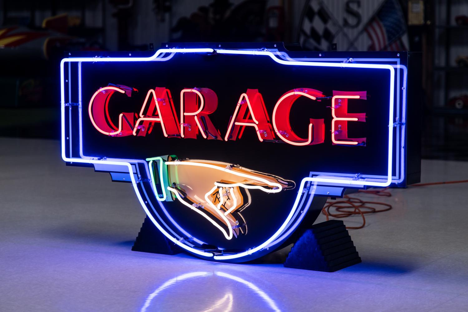 This unique Garage and Pointing Finger Neon Sign is a great display piece for anyone who has garage. This sign has been on display in a highly decorative garage for the last couple of years. The front of the sign is in excellent condition. The sign was finished in black with a cream color border and light blue neon. The words garage was finished in light red with red neon. The sleeve was finished in green with green neon. The woman's hand was finished in skin tone color with a yellow border and white neon. The neon around the sleeve and hand flashes when it's in the on position. The sign was decorated with blue and green wings that are part of the sign design. The support structure is composed of a black finished metal housing. The back of the sign is in good condition with minor scratches from resting against a wall. It's equipped with a 120-volt power cord. This sign is in excellent working order relatively light weight.