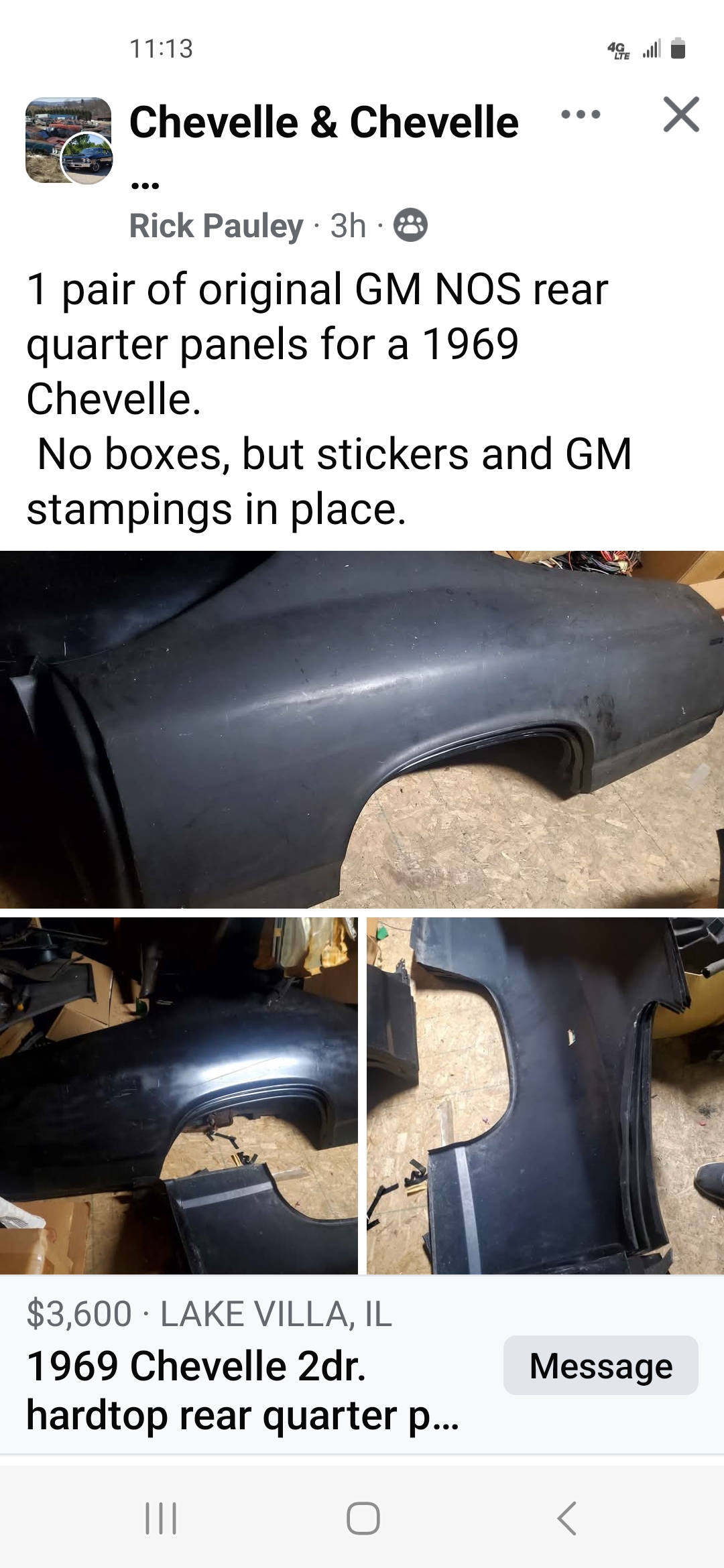 Hello all, looking for a pair of NOS 1969 Chevelle quarter panels. Closer to NC the better. Thanks for any help or leads, thanks Andy