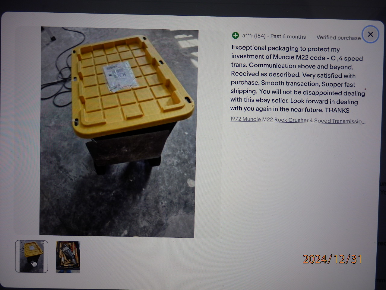 This M-22 was put together for me by a local friend of mine that buys & sells rebuilt Muncie Transmission's & parts locally & has an eBay store as well, I will provide you with his contact if you have any specific questions. Most of the NOS parts came from the Mark Bulaw Collection that was for sale on Mecum OnTime auction, Mark had enough NOS parts to build at least 4 complete M-22 transmissions. My friend Dane lives near State College, PA & ships all over the world, he also delivers for free to any Carlisle Swap Meet event. Attached are pics of Danes feedback from eBay & pics of the container he ships in.