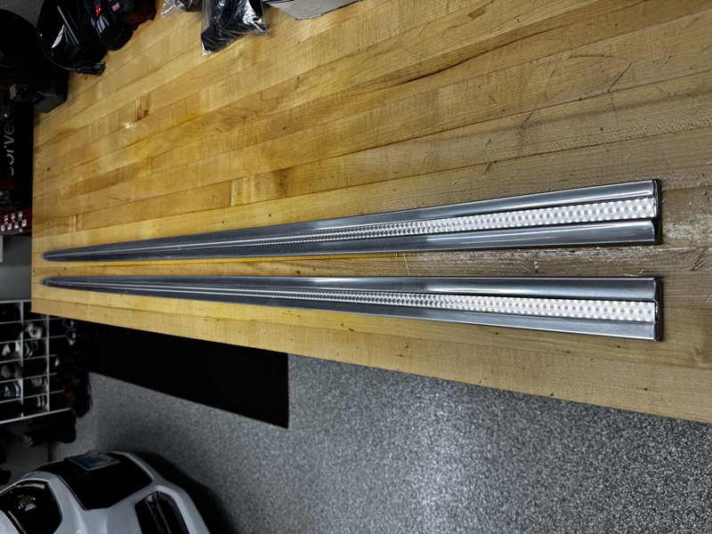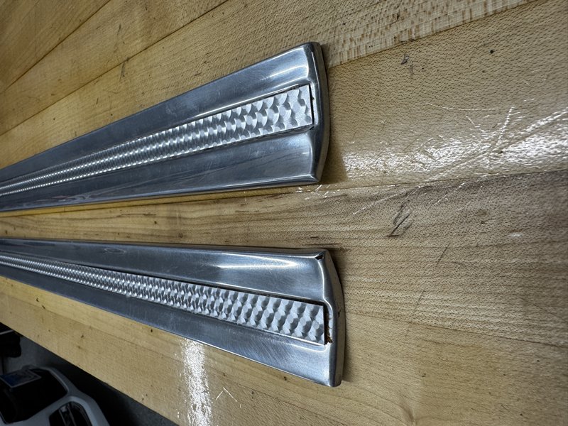 1962 Impala side trim with SS inserts and rear mounting bracket/studs. No other clips included. Not perfect, good driver/survivor quality. Insert starting to come unglued in a few small areas per photos. The door pieces have black paint applied to the area around the door handle and the insert is trimmed back. Happy to provide close up photos of any area you need to see.