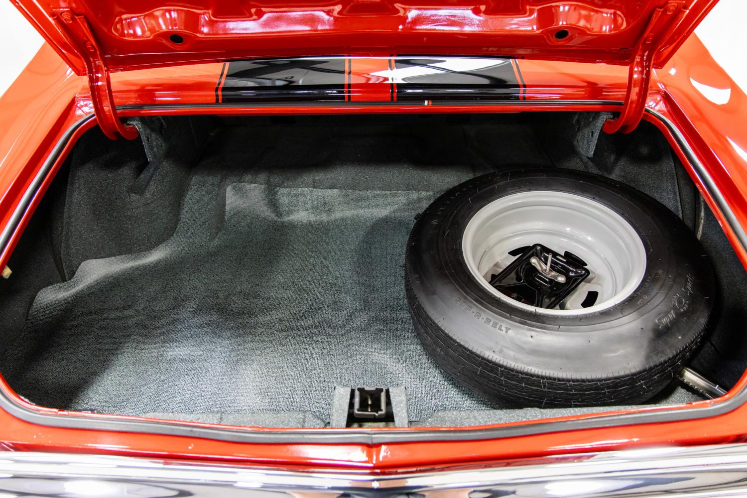 The interior of this '70 Chevelle SS is also in very nice condition throughout. From the information gathered which includes restoration photos of this car retains most of the original black interior. Some of the claimed original pieces include the SS dashboard, front bucket strato-type seats, door panels and carpeting. Everything in the interior is in working order such as the dome light, gauges including the 7000-RPM tachometer, electric clock, AM-FM radio, heating and air conditioning system. Yes, this car was originally equipped with factory AC and it still operates on R12. It's equipped with the correct style rubber front floor mats. The trunk compartment is beautifully restored including a new seal, stickers, correct trunk splatter paint, spare tire and original jack with tools. The rubber seal even has the two painted assembly marks on it.