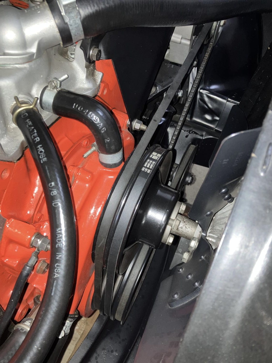 Recently Anthony has had some two and three groove 67 BB cast iron crank pulleys for sale and I ask him if he’d like me to post this picture of my three groove pulley set up on my 67 car.