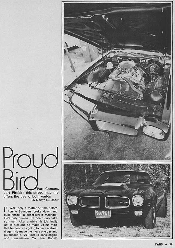 In case anybody is wondering I am doing a resto on my 1973 firebird street legal drag car,and am going to do it in a 70's retro style{I built it with the gangsta street racer look the last time},and I was thinking of maybe citrus green with a blackk Vtop,and an L88 hood,and maybe sidepipes if I could round up a set.It has a 440 inch bigblock chevy with late GM aluminum heads and a dominator,and I figured I could fit it with the retro look,and maybe some super trick wheels and give it a clean nostalgic look.That Motion firebird from 1974 has me thinking of a 70 camaro deck spoiler too.I plan on some M/T valve covers,and other retro engine dress up stuff.I will keep everybody posted of the progress.BTW,my plan is to get the sidepipe headers,then use 3.5" truck pipe and turn downs to make open sidepipes that I can have coated to look like chrome{really loud chrome}.