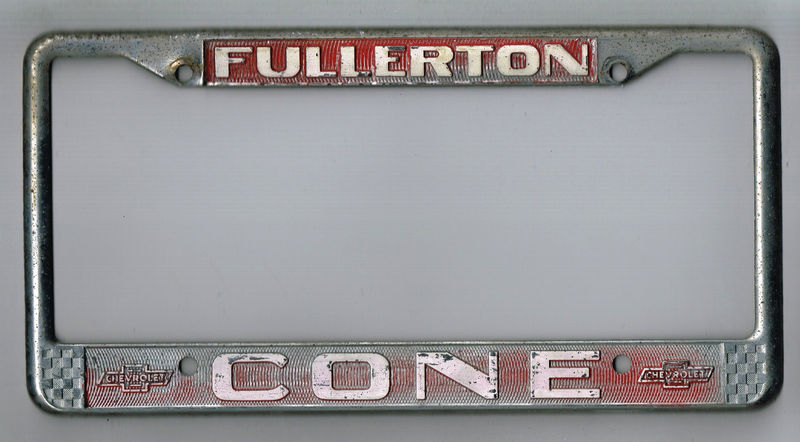 Hello...I seen these for sale and I would ask the seller. By his collection and apparent knowledge would lead me to believe he lives in the L.A. area. I finally found the correct set for my 1970 year auto but I had a picture of an original unmolested station wagon that was sold new a month from my car to go by. Xplant.. or Rpo.. may be able to help you pin point what type you need. Xplant..s brother has an original CONE sold 67 SS/RS Camaro. I know you would like to have the period correct ones but I spent 8-9 years finding mine. If I could put a price on my time I could've bought these black ones you have pictured. If it were me I would get these and if the ones you are after pop up in the future then resell these. Thats just me and not trying to help the guy who is selling these in the least. My guess is these Black ones are from the late 70s or 80s but I cannot confirm. CONE was in business from 1920s-1990s. Frames became popular in the late 50s when the plates were standard size as we se today. Another way you may be able to tell a 67-68 era is to look at a DANA license frame as the same company Robert Brown made them for both dealerships, frames along with 100s of other dealerships in that area. Color should not be a concern as you will probably rechrome and repaint anyhow. My guess is that the checkered design variations are what you need. Hope this helps.