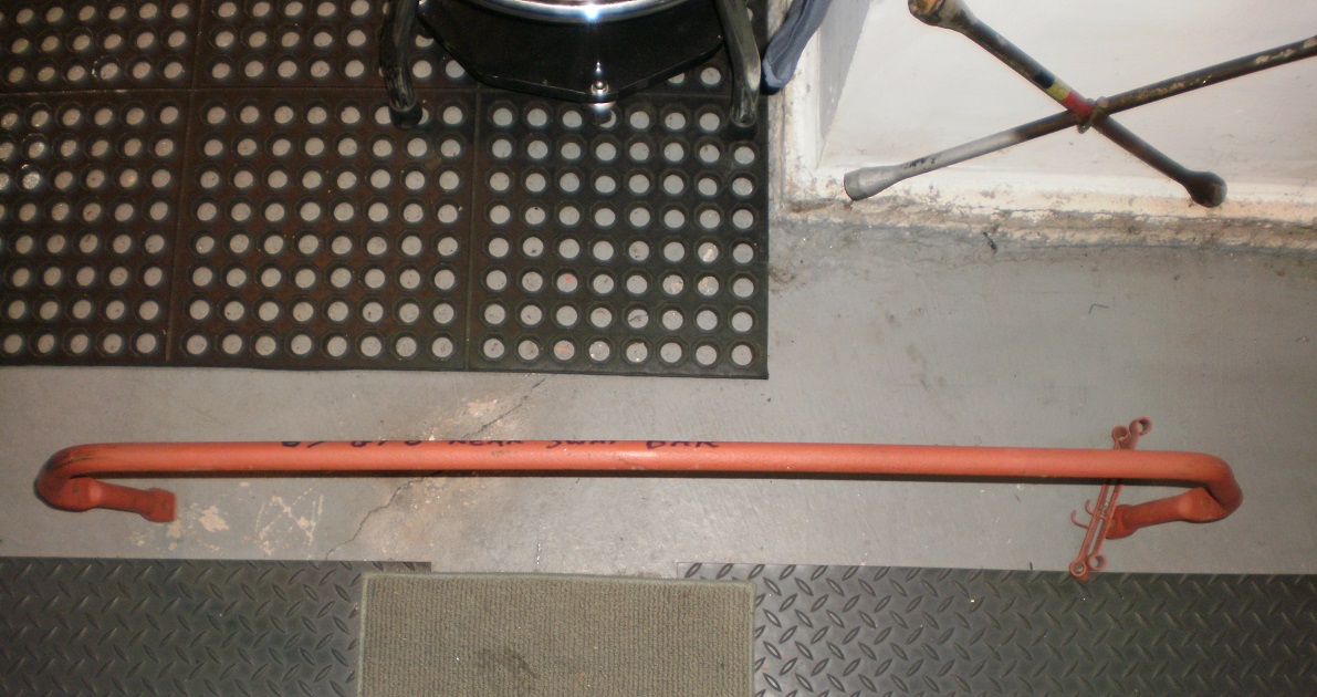 Has a slight curve in the center laying flat on the ground but does not dip in the center like a GTO sway bar. See photos and let me know what you think [img]<<GRAEMLIN_URL>>/hmmm.gif[/img] From back to back 37" From biggest curve points 41" From front curve to curve 34"