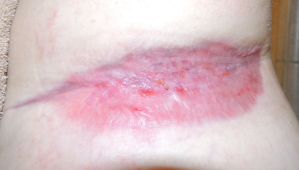 i asked my doctor to cut the scab off and she wouldnt she said let it heal on its own..if it didnt in the next 30 days i would need surgery it wouldnt heal til i cut the dead skin off..it started smelling like dead meat in the sun..so i grabbed it with a pair of pliers, pulled it out til it hurt, took a side cutter and cut the "scab" thing off..healed up in 2 weeks..it was literally 3/4 of inch thick of dead skin and a weird white scab it was in my jeans, i left on the floor, when i pulled my belt tight it bit me...and in an hour i couldnt stand up and thought i was going to die...it scared me...my skin was on fire,every inch on my body, if the wind blew,it hurt, if i started to sweat it hurt, my hair hurt too..lol luckily it was in my hip/belly are and a little fat there stopped it from getting to muscle...im not really back to normal, but getting better all the time...got a wicked scar, looks like someone tried to GUT me with big knife ![]()
