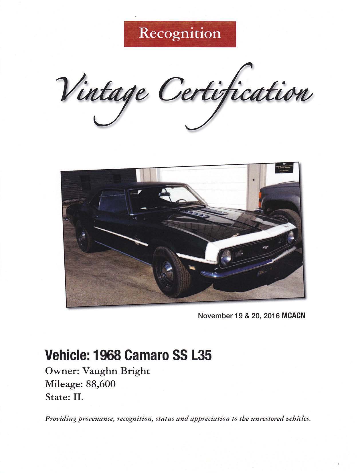 Vintage Certification™ is a judging program whose sole purpose is to recognize, provide status, provenance, and promote un-restored (survivor) vehicles. We believe it is the only program that focuses on documenting and benchmarking these cars. Our core certification team consists Brett Merryman, Chris White, Alex Sahely, Frank Badalson, Roger Gibson, Steve Shauger and other marque specialists based on make and model. Each core team member possesses over 30 years experience as restorers, collectors, historians and judges in the hobby. Typically we spend 3hrs examining in detail every segment of your car including the underbody on a lift. To learn more about Vintage Certification visit our website at www.vintagecertification.com or the MCACN show at www.mcacn.com. This is the perfect venue to have your vehicle certified. You will be among and exclusive group of enthusiast who participate in this exciting event. We understand not every original car is 100% untouched, and we offer five levels of certification, based on the originality of the Vehicle. Vintage Certifications™ five divisions: Vintage Time Capsule - Vehicles that are 95+% unrestored in all reference areas Vintage Legend - Vehicles that are 85+% unrestored in all reference areas. Vintage Heritage - Vehicles that are 85+% unrestored in four reference areas. Vintage Legacy - Vehicles that are 85+% unrestored in three reference areas Vintage Reference - Vehicles that are 85+% unrestored in at least one reference area. Reference Areas: Certification consists of two areas of consideration, Originality and Preservation. Reference areas are as follows: • Engine Compartment Area • Exterior Body • Interior Body • Underbody • Trunk (except Corvette) Vintage Certification Roster: <span style="font-weight: bold"> This year looks to be a fabulous year for unrestored Mopars. We have two 1970 Superbirds two hemi orange and one B5blue, 1969 Hemi GTX, 1971 HEMI CUDA!! Talk about a rare finds. I will update the complete list of participants shortly, but here's preview..... 1969 GTX Hemi 1970 Superbird 440-6 1970 Superbird 440 1971 Hemi Cuda 1968 GTO Ram Air Added 8/12 1971 GTO Judge Convertible (last Judge built) 1973 Pontiac Formula SD 1973 Trans Am 1973 Formula 455 4spd 1967 Olds 442 1971 Olds W30 1968 RS/SS 396 1968 SS 7k miles 1969 Z28 1969 COPO Chevelle and other fine examples.... 1971 Z28 Also our Heritage display is still available for non-judged unrestored cars. Heritage Display: 1969 RS/Z28 1968 Z28 </span>