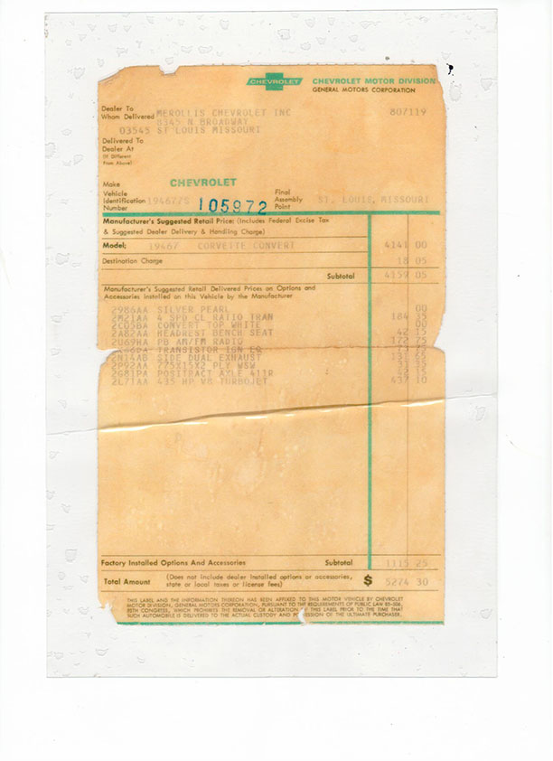 Scrolling through this website and looking at pics of this 1967 Corvette and came upon the NCRS validation of the window sticker and tank sticker. The window sticker is a reproduction document and should not have been validated: An excerpt from the ad: "Original NCRS validated Window sticker- Thinking about how special this is due to the fact that this piece of paper was adhered to the inside of the drivers window with water soluble adhesive. The dealer was mandated by Federal law to leave it on the car and not remove it. That meant the new owner either tore it off upon leaving the dealer as it obstructed the view or in the case of this car it was carefully removed by the original owner and securely stored. It has been authenticated by the NCRS as the genuine article"
