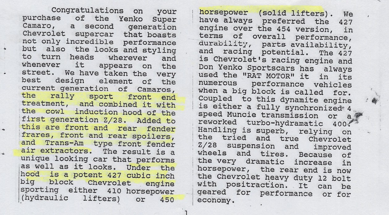 This car, with all of its original paperwork, was purchased from the original owner October 11, 2019. The original owner purchased the car through Jay Kline Chevrolet Co. Minneapolis, MN on 8-9-1973, as a new car, complete with warranty book, owner’s manual, and Yenko Tech manual. The original invoice from Jay Kline showed the "Yenko 427 conversion" costing $2500.00 with a total price of $7832.32. Starting with a new 1973 Camaro Coupe in Dark Green, with Rally Sport and Z28 options, the car was then highly modified, including a 427/450 solid lifer engine with aluminum heads, air cleaner with special seal that mates to hood with ram-air ducts in openings behind grille, Yenko Super GT Hydro 400 HD transmission with remote cooler, shift kit and 727 pickup tube and filter, Chevrolet heavy duty 12 bolt positraction rear end with 3:73 gears and C-clip eliminators, steel hood with fiberglass cowl induction added, one piece steel front end, Trans Am type front fender air extractors, front and rear fender flares, front and rear spoilers, extended trunk and modified rear jump seat, 150 speedo, cable driven tach, aluminum wheels with B.F. Goodrich 60 series tires and 427 emblems front and rear Special Yenko badging included; gold tone Yenko emblems on tail panel, glove box, and tach, Don Yenko Sportscar ID plate on the left door front pillar post, emissions decal on core support, Don Yenko Sposrtscars decal on air cleaner lid, decal on core support warning regarding aluminum heads, decals on door stating prototype does not meet Federal emissions or safety standards, special jacking instructions under trunk lid because of modified front end. As equipped the prototype went 0-60 in under 5 seconds and had ¼ mile times in the low 13s.