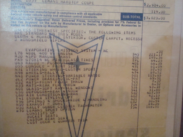 It looks like whoever ordered your LeMans wanted a GTO, but without the GTO nameplate that would have kicked up their insurance rates. They ordered the Endura Styling Option, 400 4-bbl, G70x14 tires, Springs & Shocks, all part of the GTO package. Mike