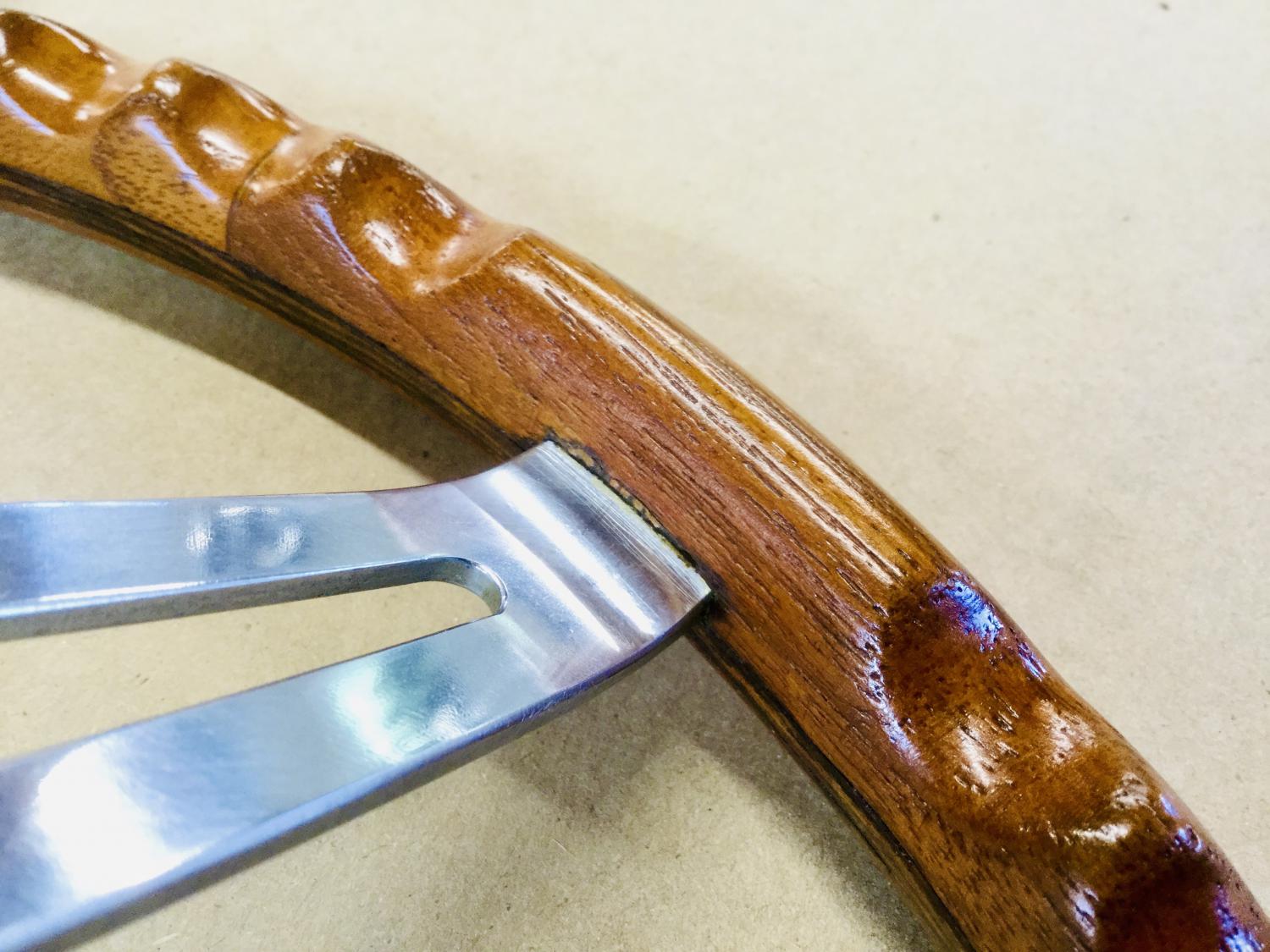 Teakwood is an extremely tough, durable wood that was also used on the decks of battleships because of its water resistance. The fact it would splinter and puncture the skin, and possibly the lungs of the driver in an accident was the main reason for discontinuing this option. I purchased this wheel in 1975 at the Bob McDorman Corvette meet in Columbus Ohio. It’s flawless and the only thing I have left of my Corvette days back in my hometown of Springfield, Illinois. |