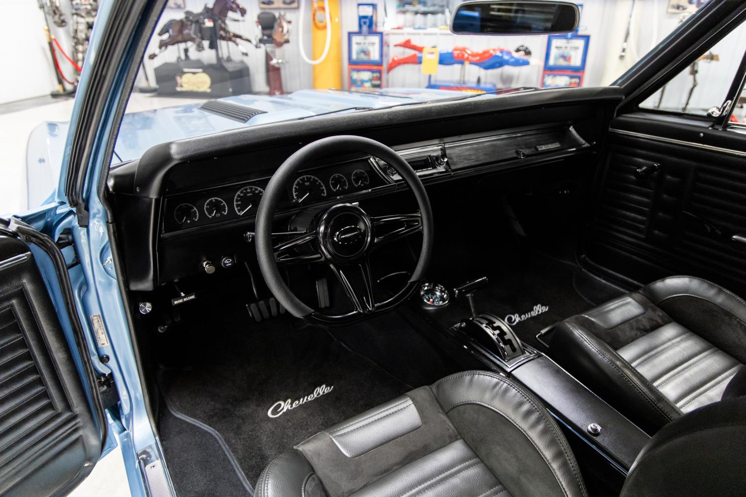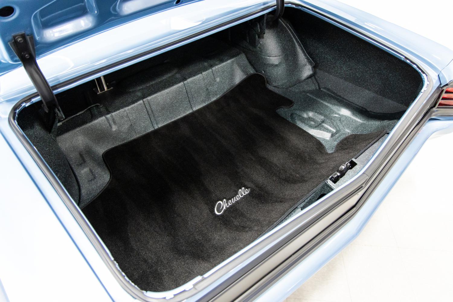 The interior was tastefully designed with modest custom touches throughout. The entire cabin was covered with sound deadening. The entire car was professionally rewired with American Autowire products. The wiring is very neat and organized throughout. It was refinished with a completely new black interior which compliments the exterior perfectly. Some of the upholstery includes the headliner, TMI sun visors, factory door panels, TMI Pro Series low back bucket seats with front and rear seat belts. Some the custom features include a modified black trimmed dash, Dakota Digital HDX gauges, lights knob, wipers knob, Flaming River black tilt steering wheel column, Billet Specialties black 14” Victory steering wheel, LG billet door strikers, full console with clock, B&M black shifter, Billet Specialties black levers, door handles and window cranks, Lokar black pedals including the emergency brake, Custom Autosound USA 740 radio with dash center speaker and molded Chevelle embossed carpeted floor mats. This vehicle doesn't have heat or air conditioning and there are a few small wrinkles in the headliner. The trunk compartment was restored and refinished in the correct style trunk splatter paint. It was outfitted with a black Chevelle embossed carpeted trunk mat.
