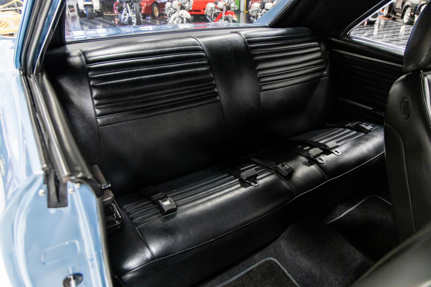 The exterior is simply striking with its iconic factory design and beautiful color combination. During the restoration process most of the sheet metal was replaced new which is fully documented with receipts and photos. Countless hours were spent making the body straight along with excellent panel fitment throughout. The hood, doors and trunk close very nicely. The car was finished in its original factory correct color of Nantucket Blue which looks stunning. The paint is high show quality throughout and was recently detailed by the team at MS CLASSIC CARS. The tucked front and rear bumpers were also finished in Nantucket Blue for a unique appearance. The wiper arms, glass trim, hood louvers and trim, front grill, door handles, trunk lid trim and tail light bezels were finished in matte black. The tail panel was wrapped in matte black so it can be removed in the future if desired. Some of the custom exterior features include all new tinted glass throughout, Ring Brothers black billet mirrors, Uni-shine LED headlights with daytime running lights and black front air dam. The front fenders were decorated with 427 cross flag emblems. The car has a great stance on new BOZE B1 Flo-Lite Satin Black wheels that are 18 x 8 on the front and 18x10 on the rear. The wheels are wrapped with new Firestone Firehawk Indy 500 tires that are 235-40-18 on the front and 275-40-18 on the rear.