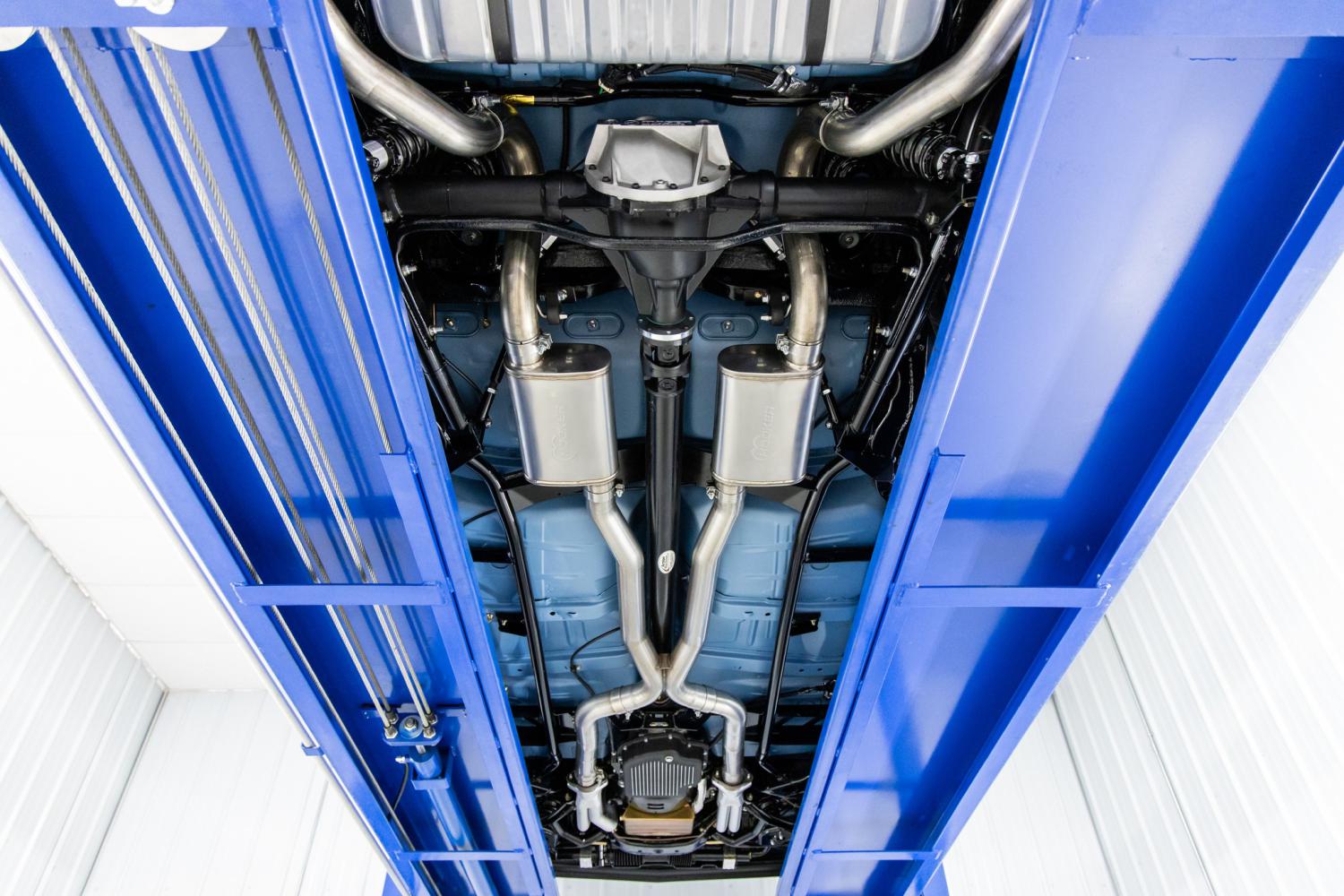 The engine compartment is highly detailed throughout with new parts. The backside of the hood was painted Nantucket Blue and it pivots on Eddie Motorsports black billet hinges. The smoothed firewall and inner fenders were also painted Nantucket Blue. The black radiator support was outfitted with a custom black show panel that proudly displays Back Bay Customs plaque. The car is powered by a new fuel-injected GM Performance ZZ427 crate engine that was dyno tested with 534 horsepower and 536 lb-ft of torque. The engine dyno sheets are included. The engine is fed through a Holley fuel injection system with a Terminator Stealth EFI carburetor, Sniper coil, Hyper Spark distributor and HP ECU. Some of the features include black Chevrolet 427 valve covers, black round air cleaner with 427 Cross flags and horse power decals. CVF black pulley system, black radiator thermostat housing, Lokar throttle cable, black billet dip stick, Chevrolet Performance wires, Milden Gold oil pan, Aeromotive fuel pressure regulator, Power Master 9500 starter, 140-amp GM 1-wire alternator and NAPA Legend battery. It's equipped with a New Port engineering wiper motor, Bosch electric power brake booster and Wilwood master cylinder. The engine is cooled by a Cold Case black aluminum radiator with dual electric fans, custom black cap and braided overfill line. The engine breathes through Flow Master ceramic long-tube headers and a 3” stainless dual exhaust system with Hooker mufflers. The engine is coupled to a TCI Street Fighter Turbo 400 automatic transmission with black finned pan. The power is transferred to an Action Machine custom driveshaft and Moser 12-bolt POSI rear end with 3.73 gears. It's equipped with power rack and pinion steering with a Turn 1 pump, Holley black billet reservoir and CPP u-joints.