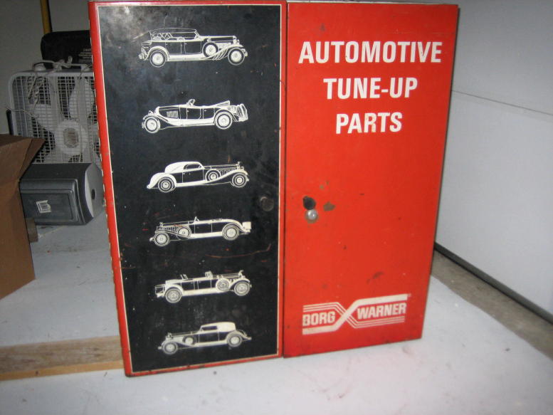 I know some of you guys are into vintage shop equipment, I picked this up over the weekend and didnt know if it was valuable or not. I was going to hang it in my garage but I play rough, if its not worth much I wont worry about it, if it is I may pass it on to someone who has a vintage shop set up. Cool cabinet either way. Im interested if anyone has seen one of these before and approximate year, the cars on the cabinet are all pretty old, the handle on the front is plastic, maybe the Borg Warner logo could indicate age if the logo changed over the years. Thanks