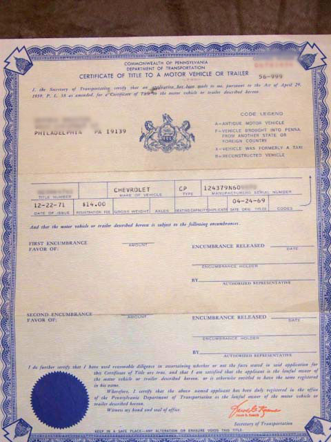 Thanks for the PA title info link. I will see what I can come up with. Attached is the oldest title I have so far, dated 12-22-71. I agree, seems like a dual fuel pump would make more sense. Again, I'm just not sure what this car is, but it is definitely not a plain jane. |