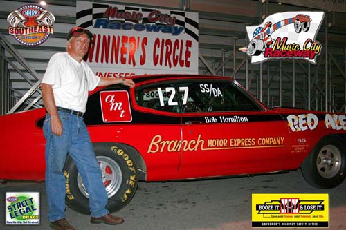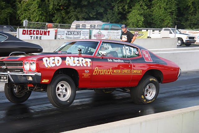 One on the highlights, well actually the main highlight, was at the track on Thursday. I had only made a couple of passé sin Red Alert this year, so was kind of nervous, as I did not want to do anything to embarrass RA in front of all of the Chevelle folks on hand. Well, as it turned out, no need to worry, as RA performed flawlessly, opening with a twisting, front wheel pulling 7.14 and backed by a couple of .08s, at around 98 MPH, which was good enough for low ET among the Chevelles. I was about to load when the PA announcer said there was a local racer with a late model Mustang in the crowd that was going to show the Chevelles how it was done. On his first pass he put down something like a 7:30, at which time the announcer then says are there any takers (Chevelles) wanting to race the Mustang.? How about Red Alert? We,, anyone who knows me I know I cannot let a challenge go, so I agreed to a one race shootout, heads up. Though it appeared I had a couple of tenths on him, I know in the world of drag racing, you never assume anything. They called us to the line, we both did out burnouts, then it was time settle things. As not to give the race away, and because I had relighted on the pass before, I made sure I was slow off of the line. The Mustang got me a .10 off the line, and a .10 at the sixty foot, but once RA settled down I had a .10 on him by the 300’ mark, taking the win light with a 7.0503 @ 98.63 to his 7.2850 @ 94.96. Needless to say the Chevelle folks cheered as I brought RA back down the return road. Later on I visited with the guy with the Mustang, really nice guy, his mustang is his daily driver, but he is one of the top guns at the track. ![]()
