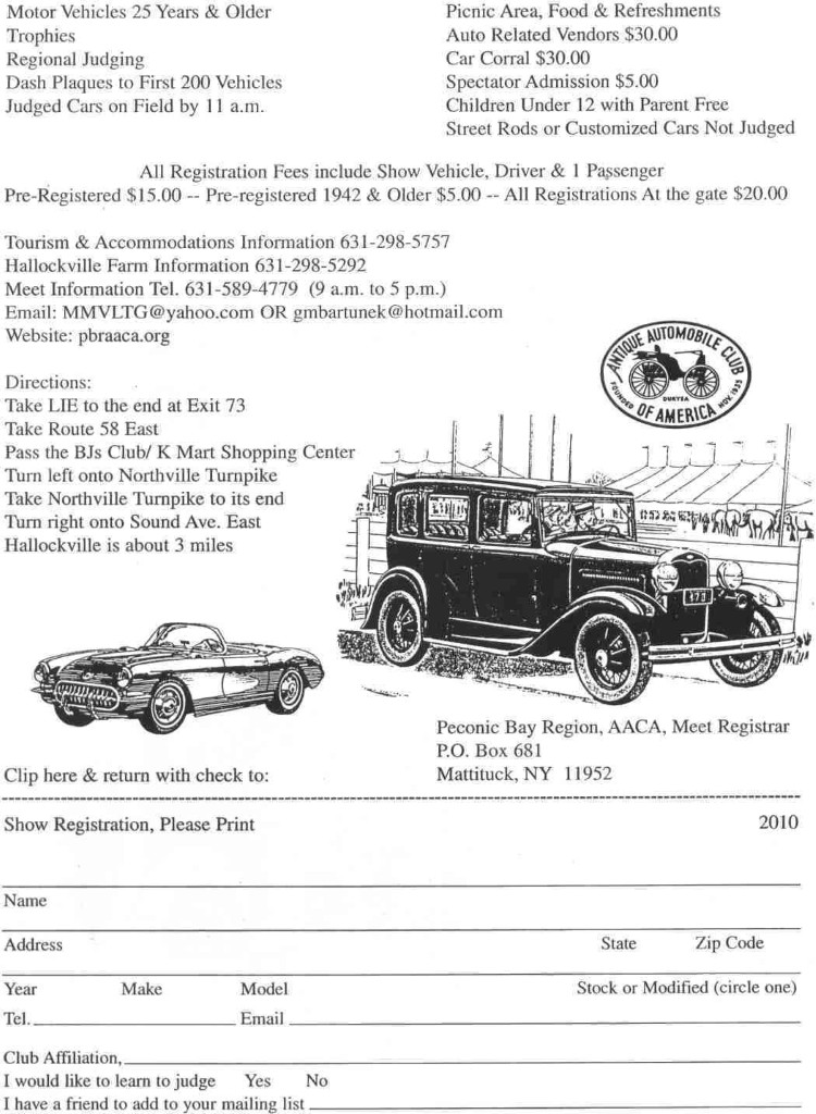 October 3rd, Riverhead, NY. You Are Cordially Invited To Eastern Long Island To Attend The Peconic Bay Region Antique Automobile Club Of America Hallockville Farm Meet, Hallockville Farm Museum, Sound Avenue, 9AM-5PM, Rain Date October 10, Motor Vehicles 25 Years And Older, Trophies, Regional Judging, Dash Plaques To First 200 Vehicles, Judged Cars On Field By 11AM. Tourism And Accomodations Info: (631) 298-5757, Hallockville Farm Info: (631) 298-5292, Meet Info: (631) 589-4779 9AM-5PM, [email protected], [email protected]