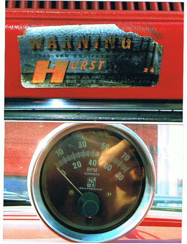 This belongs to a friend of mine, it is a low mileage 2 owner car black with red and white int. one repaint factory bucket seat 4-speed 383 4 bbl. Look at the Hurst sticker on the dash and the tach. The sticker reads Warning This car equipped with Hurst Floor Shift, Shift as Hard as You Please But Don't Break Your Arm.