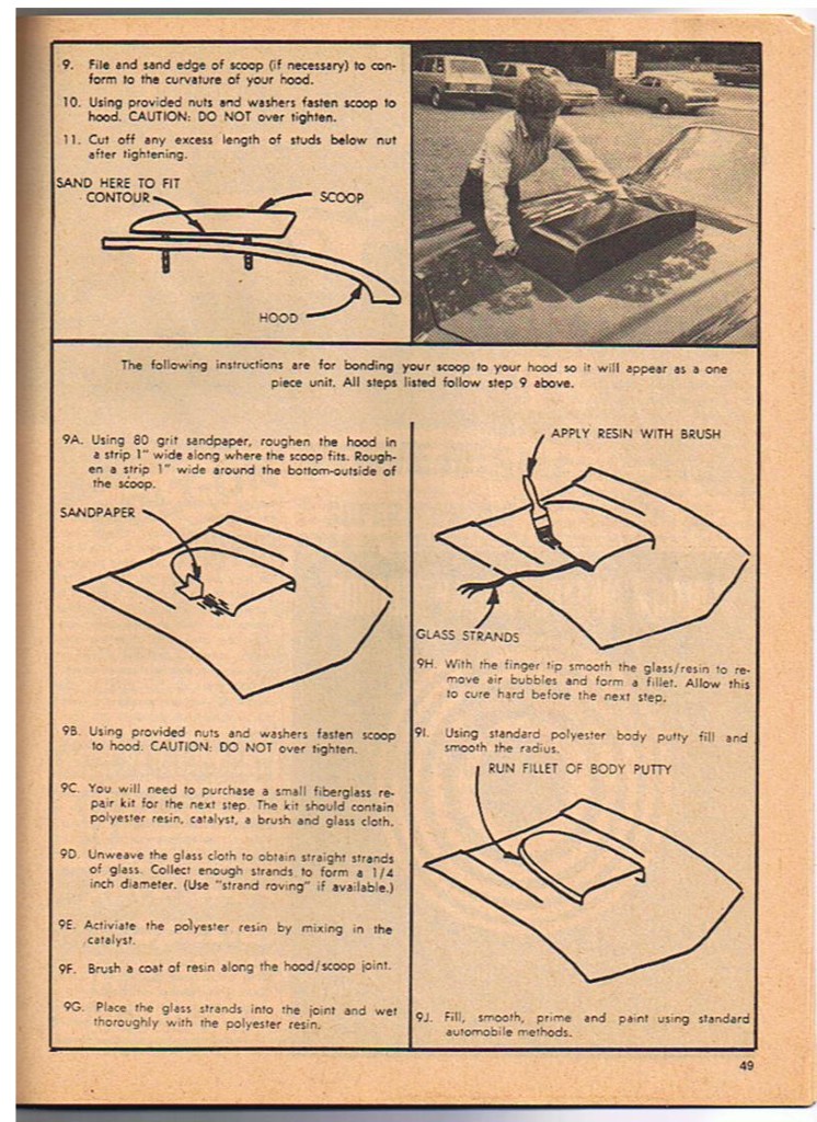 One of my clients was a fiberglasser back in the 70's. Made anything from dune buggies for Meyers(still has the molds), boats, fiberglass for appliances,display cabinets for retail and industrial applications etc. He said he would make a mold from mine and make copies but I hate to remove mine from the hood. I was hoping to find another and hang the painted up for display. My scoop also needs some work before a mold is made from it. The scoop has drooped on top maybe 1/4" from age and on one side it has sucked in slightly. |