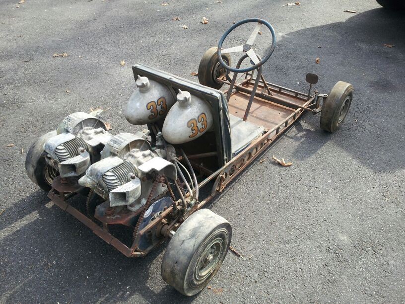Short on time time tonight (busy weekend ).So only one picture and brief story .Built in 1960 has 2 Clinton engines with a ton of Palmini and other vintage kart speed parts . Plus disc brake /axle driven fuel pump/Dell'orto carbs /real magnesium wheels /racing slicks ,etc .Plus a box of spare vintagespeed parts .