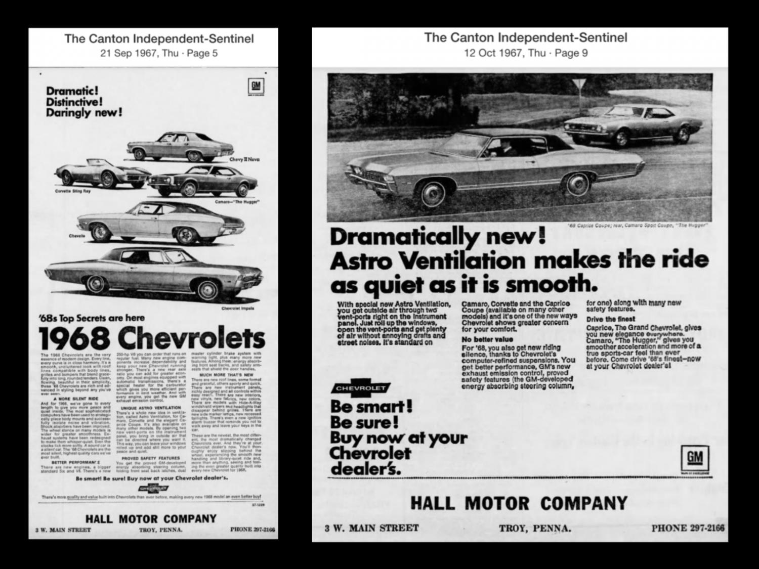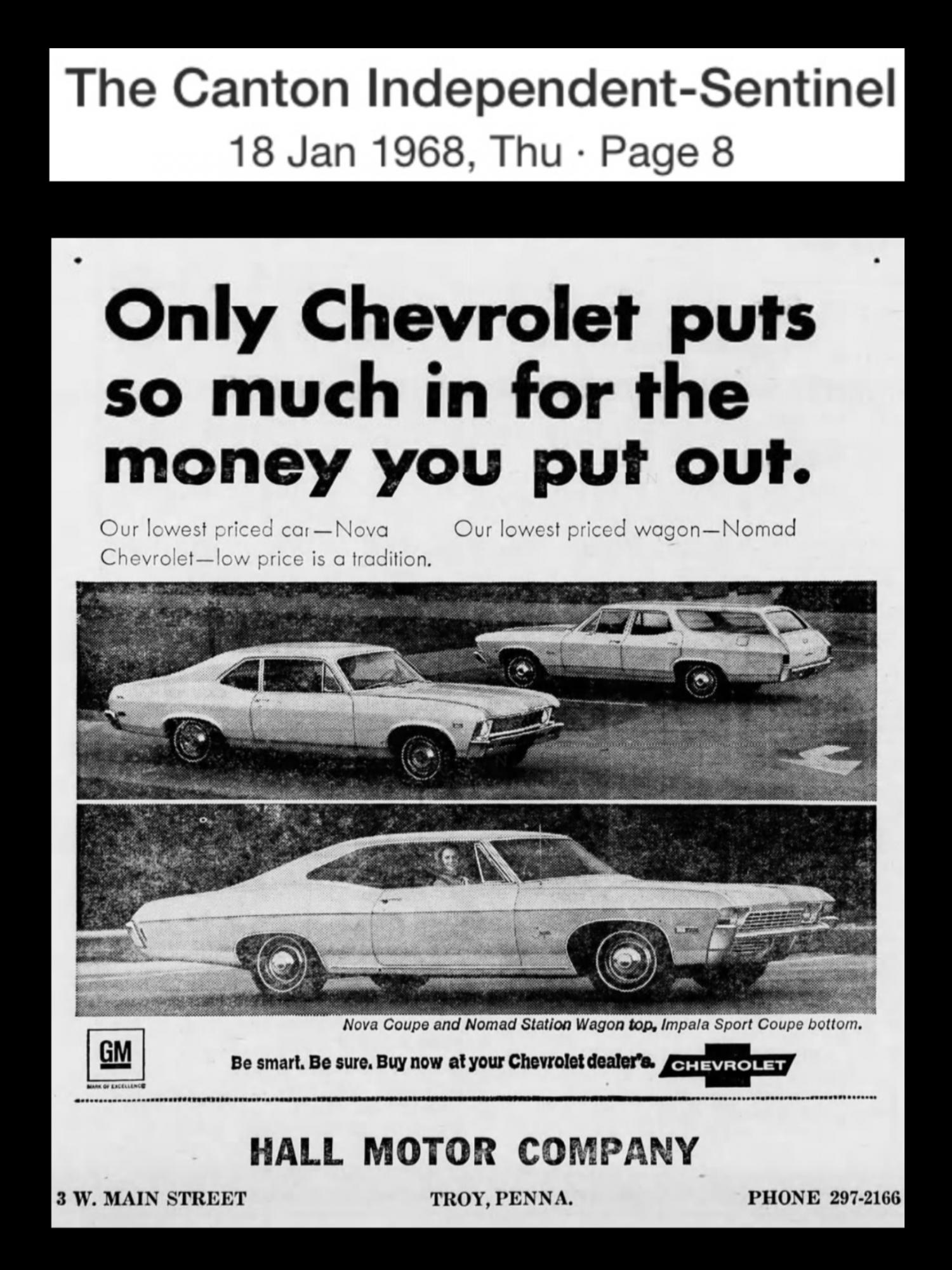 Hall Ad below from 01/68 is all I could find w/ a Nova Coupe pictured. OP has a ‘69 L78/M40 shipped to Hall, I’ll post more ads if I see anything else cool. ![]() ~ Pete .