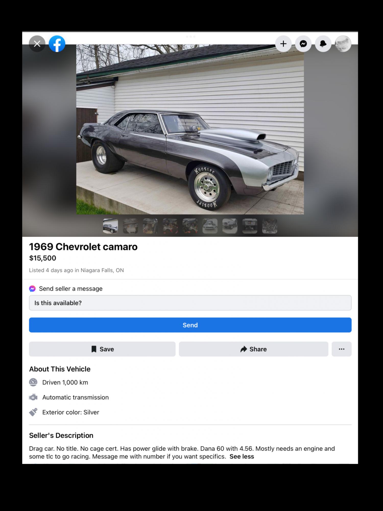 Not mine, just saw it on F’Book and may be what someone here “needs”? Race car w/ no title but even as parts w/ Dana etc, may be worth all they’re asking in Cdn. $ or will accept? ![]() Click here… https://www.facebook.com/marketplace...4-f849c1059859 ![]() ~ Pete .