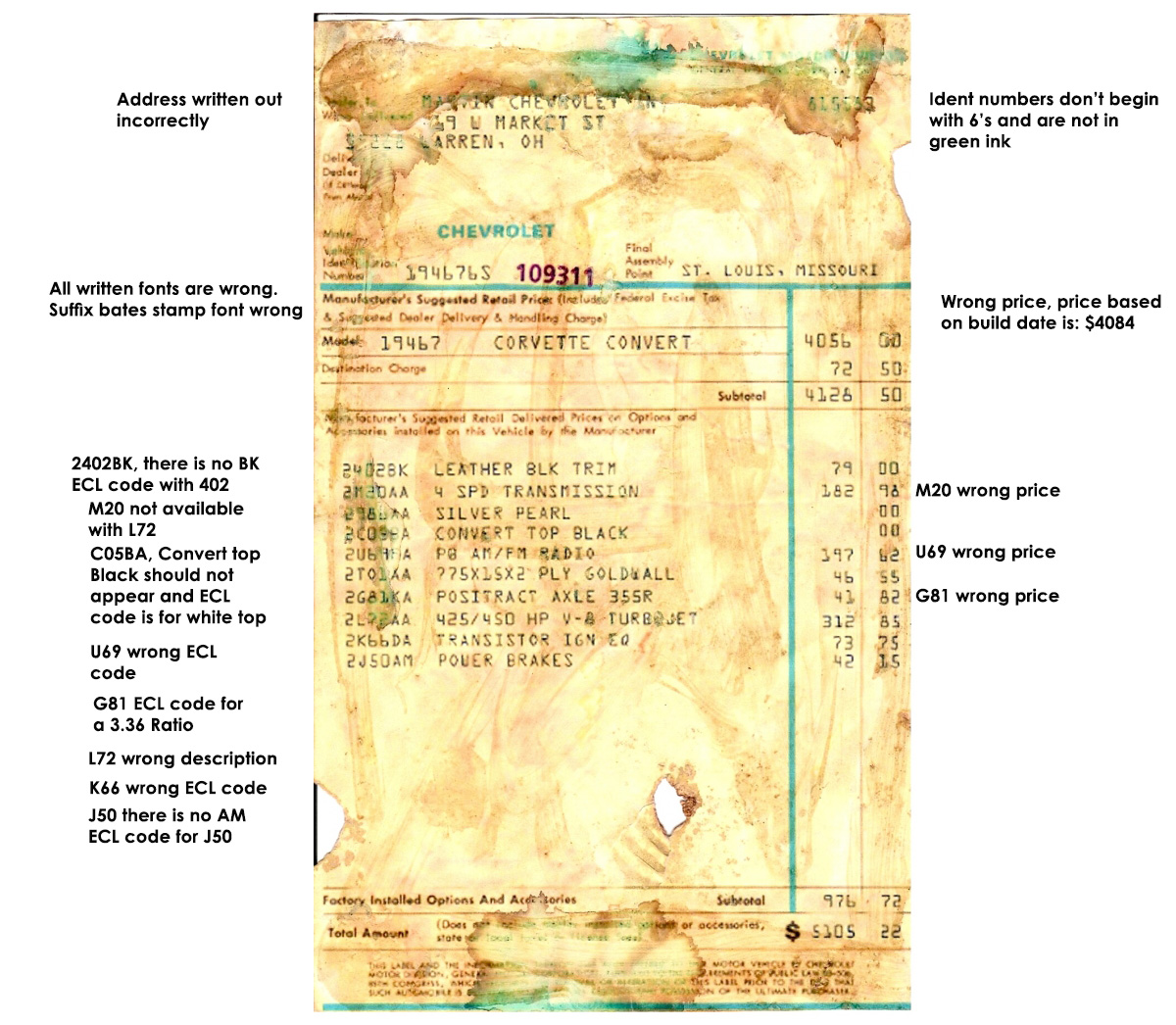 There is a 1966 Corvette posted on another website that is quite beautifully restored. The attached window sticker was posted with a claim to be the original window sticker for this vehicle. The Admins on this site do not allow anyone to refute supporting documents toward a car's authenticity, they consider this interfering with a sale and charge you with an infraction for doing so. I don't have any issue with reproduction documents as long as they are introduced as such.