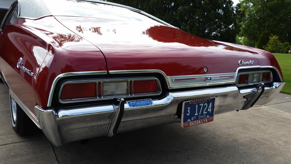 Funny, he told me that the Brooklyn Chevy dealer decal was originally on the top left side of the rear bumper. There were some light scratches in this area on the chrome and he told me those were from him removing the decal years ago when the car was new. Hence, I had to put a decal right back in the same spot plus it covered the scratches!! He also found the original hubcaps for the car and gave me same..