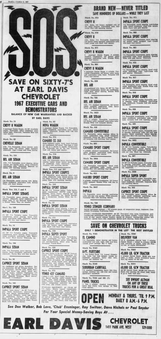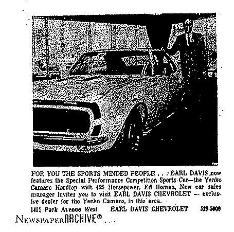 Earl Davis ad including a Yenko Stinger and Yenko Camaro. I wonder if there are records for these two vehicles?