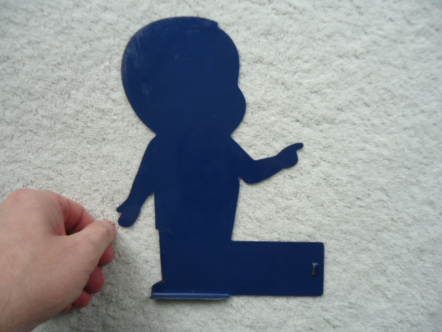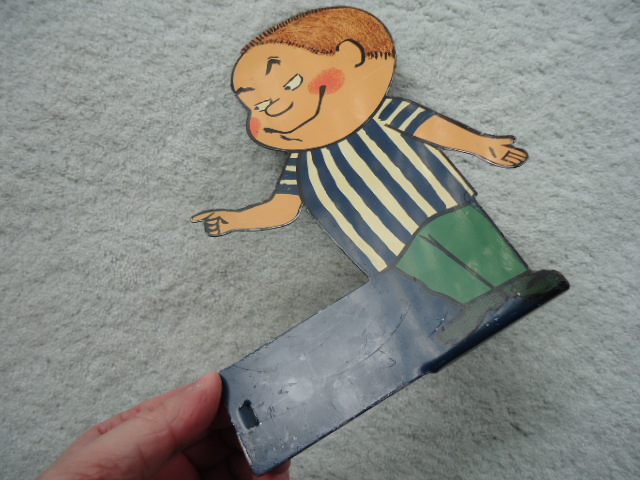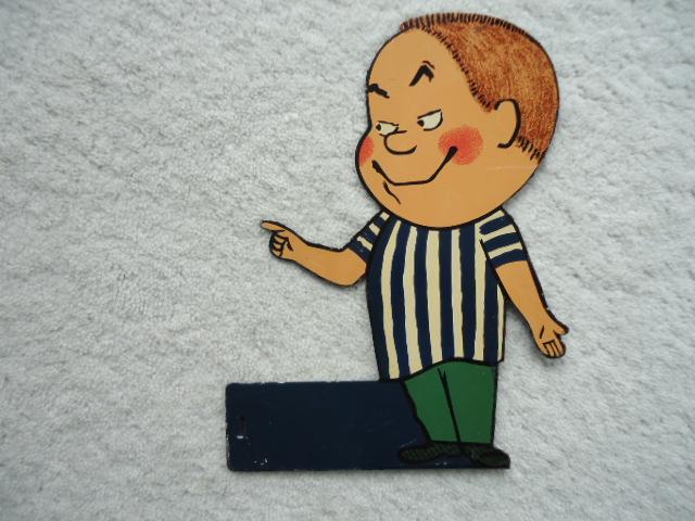 Vintage 1950's metal Freshie Boy advertising sign.This would've been pointing to a battery on the counter.