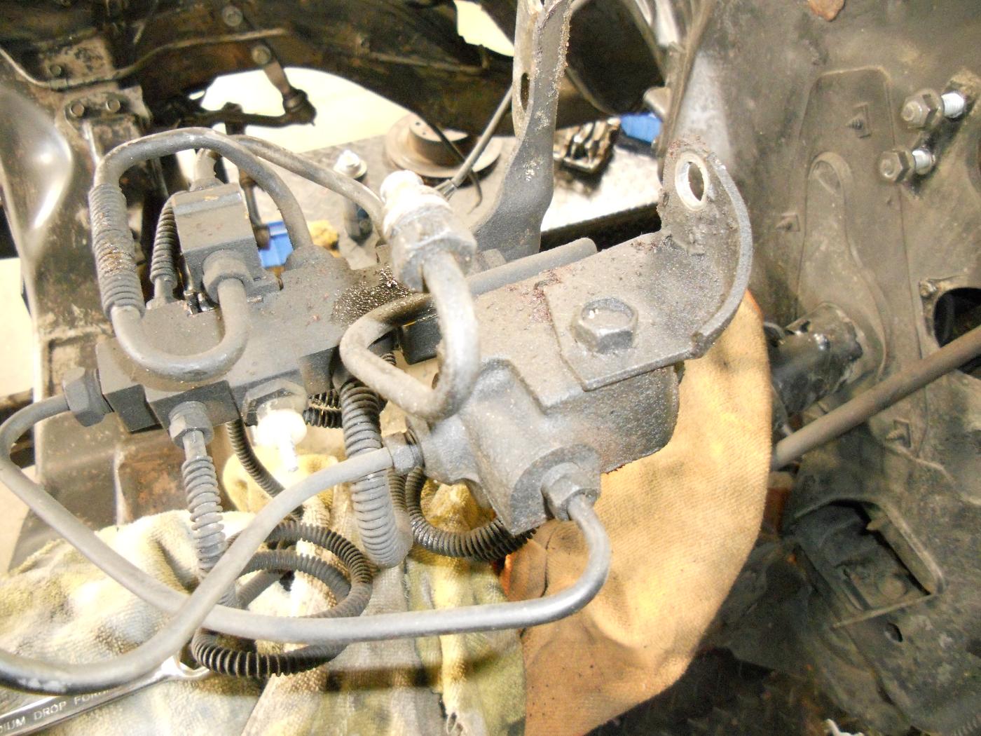 Get an inspection mirror and see if it's attached to the underside of the block/body...can't see the whole piece in your pics. EDIT AND ADD: Looking at your first pic....does that bracket run all the way up to the area where the steel brake line/fitting is attached to the "valve body"???