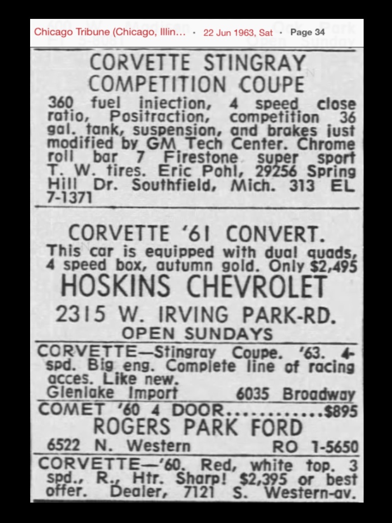 INFO ON THIS CORVETTE !!! Sold new by: Jim Connell Chevrolet, East Cleveland, Ohio Dealer Code 93 in Zone 28, Production Date Feb. 12th, 1963 ![]() Sold new by: Jim Connell Chevrolet, East Cleveland, Ohio Dealer Code 93 in Zone 28, Production Date Feb. 12th, 1963 |
