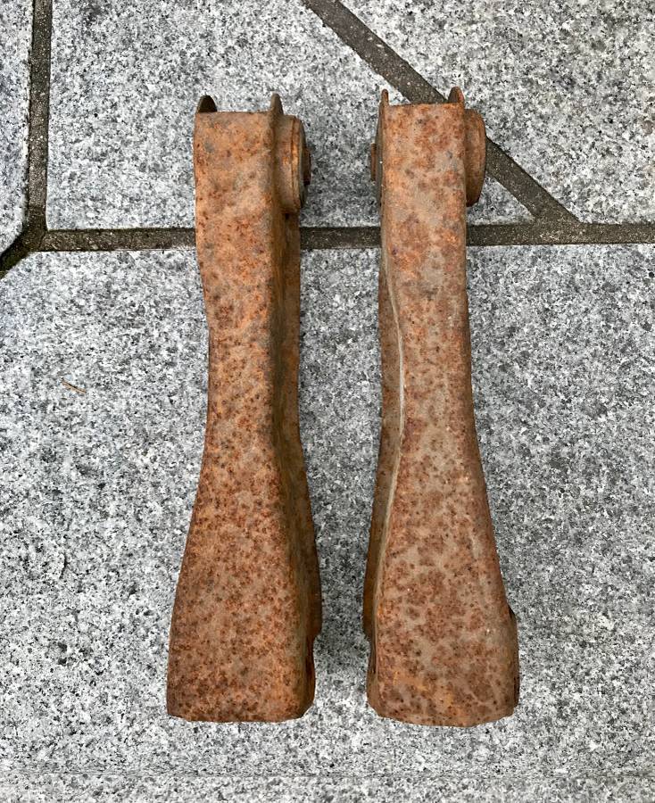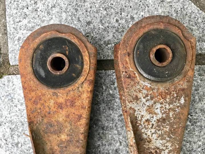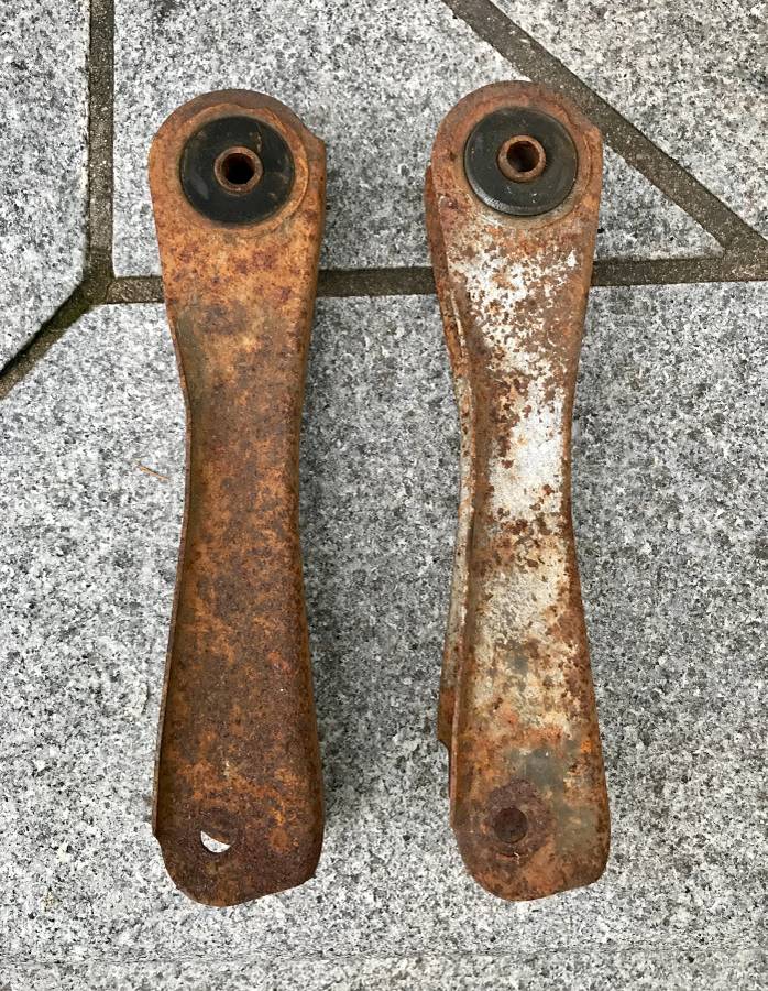 This is an original pair of GM upper control arms for 1968-72 Chevelles & El Caminos that were equipped with a 12-bolt rear axle. The left arm is notched and is reinforced around the bolt hole from the factory to clear the size of the differential housing. They are in good restorable condition with the original bushings intact. (SOLD)