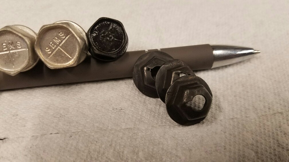 The 2 3/8-16 cad plated bolts with SEMS head marking attach the bumper guard to the bumper. The 2 23 head marking 5/16 18 bolts attach the bumper guard to the lower valence. The six c stamped steel nuts attached the insert to the bumper guards. These are all original pieces restored and ready to bolt on. $80 if you want them. Let me know. Thanks rich |