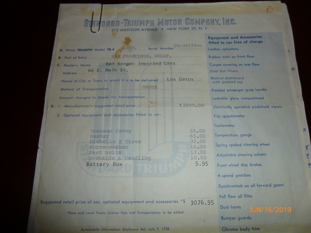 I drove 5000 miles round trip in a week to buy this 1965 Triumph TR4 from my sister in law. She and her first husband bought this car new on July 30, 1965 so she owned it just short of 54 years. My youngest daughter will become the second owner. The car was driven regularly when new and then less and less as the years went by. It was parked for the last time around 1982. It was moved once when my brother in law and her bought a new house around 1986. It sat in the same spot since then until I loaded it on the trailer Thursday. It had one repaint in the early 70's after a minor fender bender with the right front. She reupholstered the seats and replaced the rugs around 1976. The car has 123,000 miles and the motor has never been out. Not a speck of rust!! I am looking forward to getting it back on the road! |