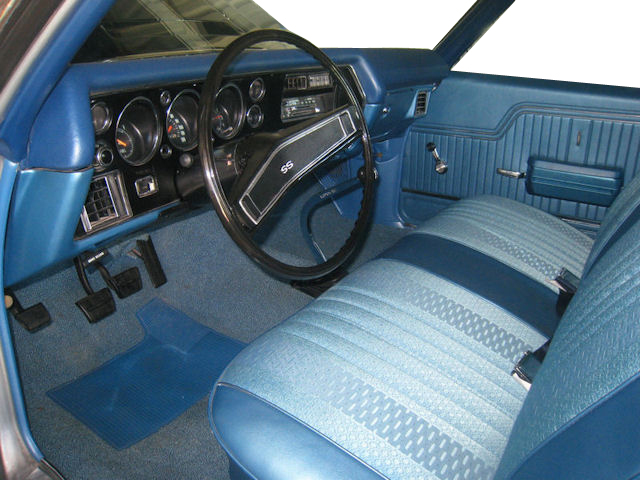 This Chevelle SS is talking my language, wearing its original factory Fathom Blue paint with a cloth bench seat, 4-speed, cowl induction, white stripes and vinyl top, etc. Wow!