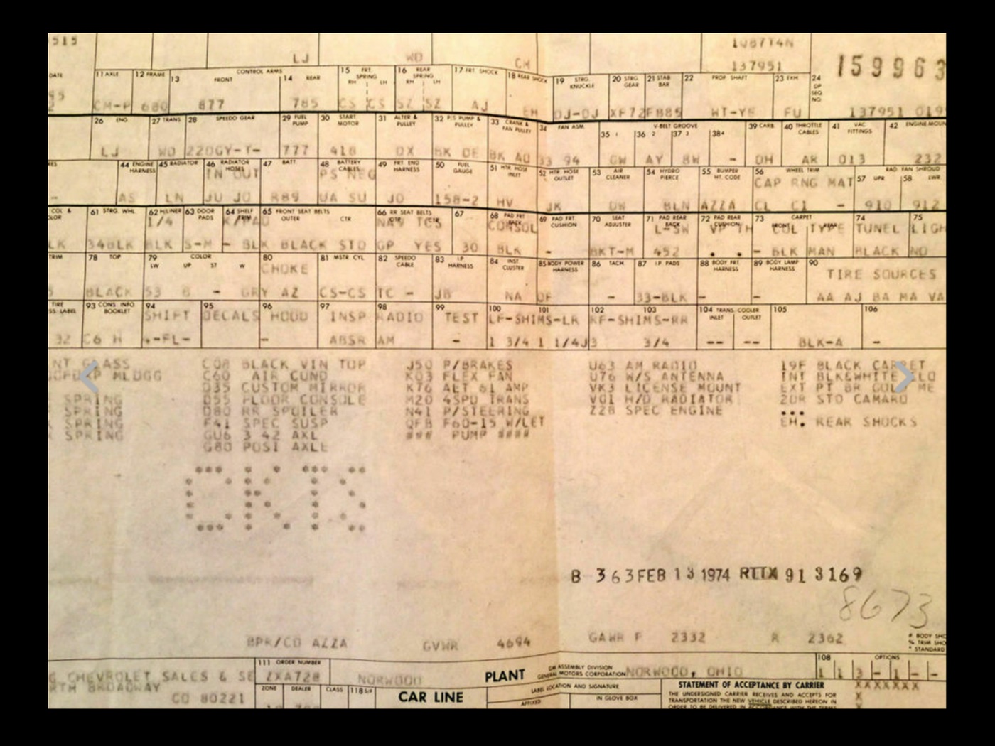 Thanks for posting the build sheet pic Pete. I saw it in the auction. You don't see Norwood sheets that often. I've searched my Z a few times but have found nothing. As others have said it shouldn't have the stripes. It wasn't called out on the build sheet and if it did, it wouldn't have Z emblems on it. It is the first '74 Z I've seen with the houndstooth interior. The build sheet calls out "INT BLK&WHITE CLO".