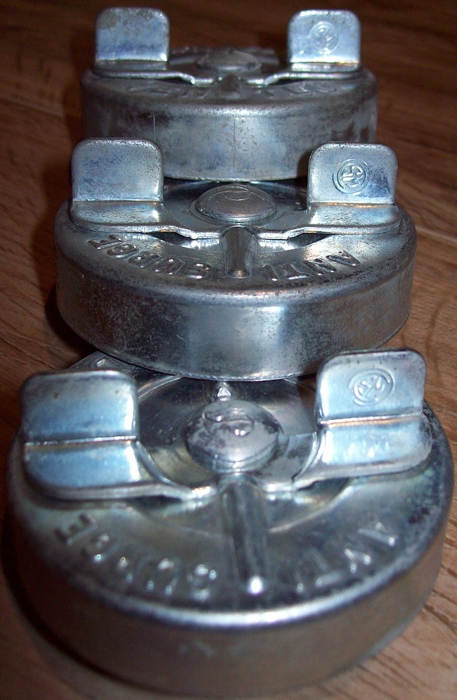 Concourse Mint GM NOS "ANTI SURGE VENTED" gas caps. The only difference from these Over the counter GM NOS caps is the rear Gasket, Assembly line caps came with a Cardboard paper gasket, GM later improved them by asking Stant Manufacturing Corporation to put rubber gaskets for a better seal. All caps have correct Embossed Fonts with "SMC" logo on one of the handles side and Pinched center "S" big rivet. I have NO boxes as I bought these as a lot from a dealer close out on the internet.
