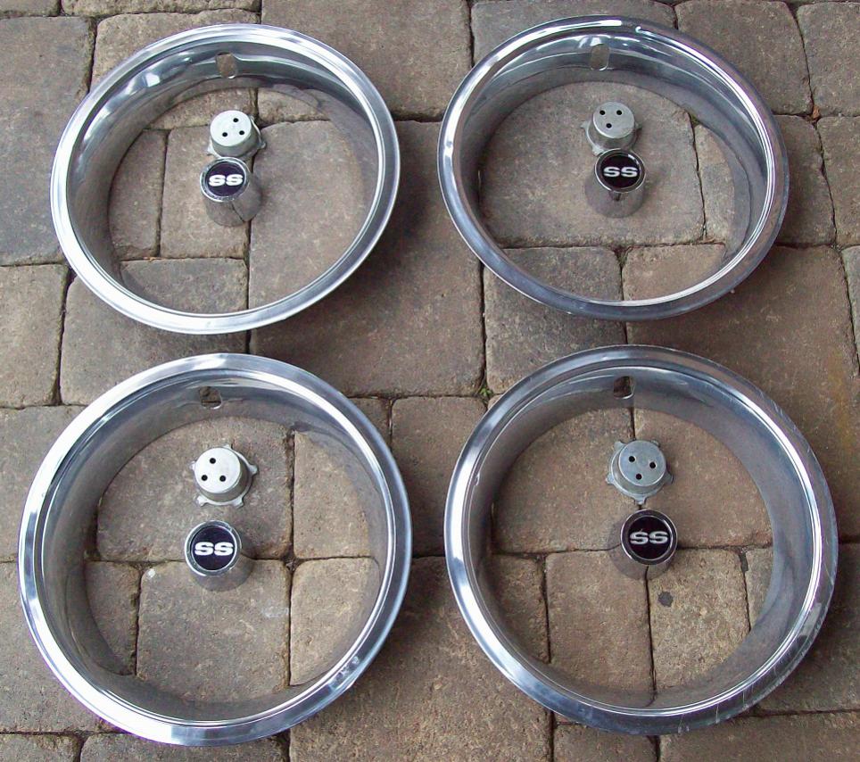 Three are dated 4 30 (April 30 1970) and one dated 4 29 (April 29 1970). The hard work is done of blasting them and giving them the proper Gray Primer base. Lug nut holes are not stripped and no Bobbles when rolled out. I will include for 4 GM trim rings in used Driver Quality, also 4 Shallow SS Center Caps with Retainers that are used GM in excellent condition. Two rims had dents on the edge from a pry bar but I have straightened them out the best I can, will not effect the seal of the rim to tire and will not show when trim rings are installed IMO. You can repair them further for perfection before final paint job. It is very hard to find a Matched set of AO SS rims in this nice condition. $750 USD, Shipping to USA from Canada $200 USD (4 separate boxes) Shipping in Canada $100 USD. Pick up in person welcome. $600 without the trim rings and center caps/retainers. Paypal "Friends"
