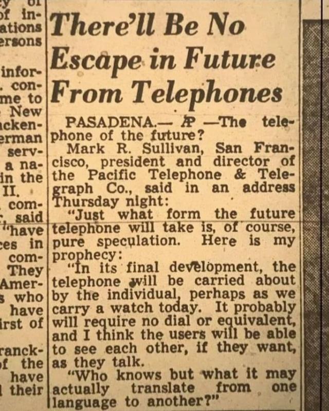 This is a genuine newspaper clipping. The above-displayed report was written by the Associated Press and was published in a variety of papers in 1953. While we have not been able to locate this exact clipping in the Tacoma News Tribune, we have found this story published in news outlets such as The Spokane Chronicle, The (Wilmington, Delaware) News Journal, The Akron Beacon Journal, and the Boston Globe: Fri, Apr 10, 1953 – 32 · The Boston Globe (Boston, Massachusetts) · Newspapers.com This 1953 prediction has proved to be largely accurate. Modern phones are certainly “carried about by the individual.” Phones can also be integrated with smartwatches, perform video calls, and provide near-instantaneous translations. While this is a genuine newspaper clipping from 1953 containing a largely accurate prediction about modern phones, we’d like to provide a little additional context to this rumor. For starters, the person making these claims was the president of a phone company and was likely privy to latest developments in the field. For instance, while it wouldn’t be until the 1960s for the first cordless phone to be invented, and the 1980s for true mobile phones to hit the market, the foundations for these products were being laid prior to 1953. In 1946, AT&T offered the first commercial mobile telephone service to subscribers in St. Louis. Users had to have about 80 pounds of equipment installed in their cars, and the service could only handle a handful of calls at a time, but it did mark the beginning of the mobile-phone era. Video calls, too, can be traced back to at least the 1930s. While it would take decades for this technology to be refined into a commercial product, the concept of video calling wasn’t entirely far-fetched in 1953. Lastly, it should be noted that Sullivan wasn’t the first to envision a smartwatch. While this product wasn’t in development in the 1950s (as far as we can tell), smartwatches had popped up a few times in fictional content. Detective Dick Tracy’s two-way watch radio made its debut in 1946: