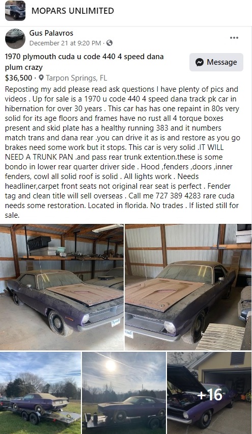 I dont know why he seems to be stuck on that really high $37K asking price. It's not like he doesn't know their actual value since he just sold a really nice driver 70 R/T-SE 383 auto/A/C Challenger for $37K. That car was worth the 37K, this Cuda is nowhere near that price range in current value.