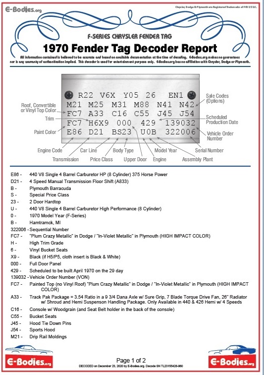 Here's the fender tag decoded: it came with an AM-8 Track, (looks like it's still present in the photos) a center console, and 1970 style narrow chrome racing mirrors (the one's in the photos are later, large oval 1971+ mirrors), otherwise it's a sibling to my car (minus the engine/shaker).