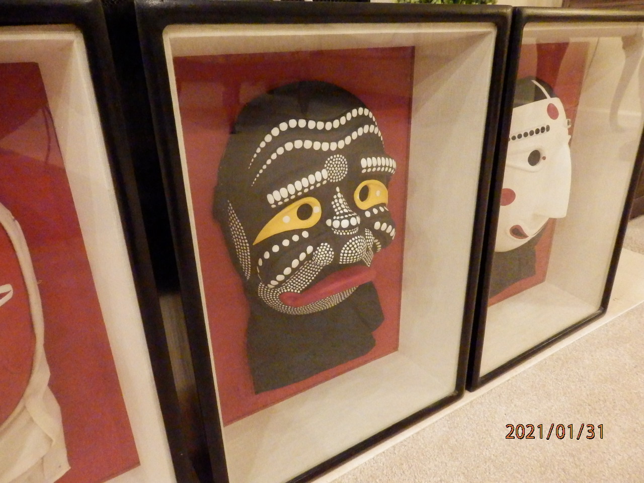 These are Vintage 1970's Korean Face Masks that my girlfriend brought to the US in 1975, she had them professionally mounted in a recessed frame. I had these on display in my home until the grandson was 3 yrs old, he was afraid of them every time he would come visit. They have been stored away for safe keeping, but it is time to let them go. They measure 18.25" H x 13.25" W x 4.5" deep.