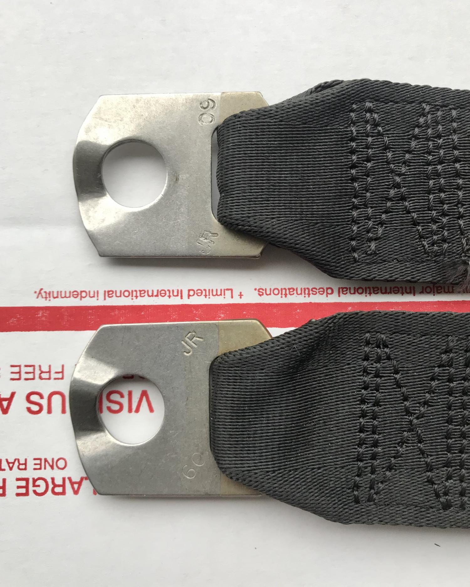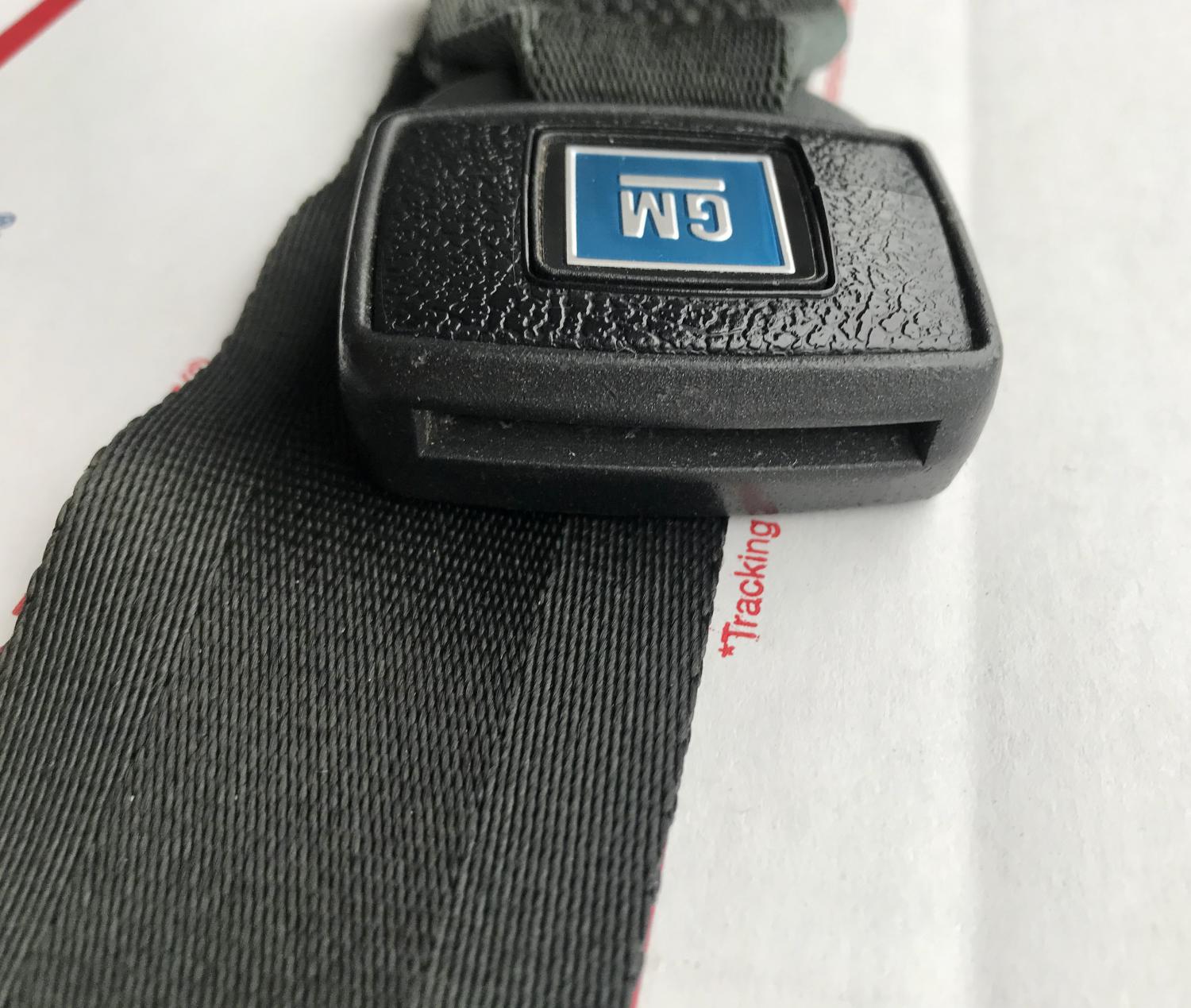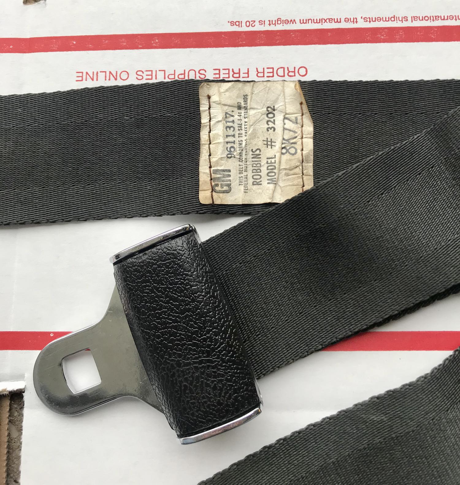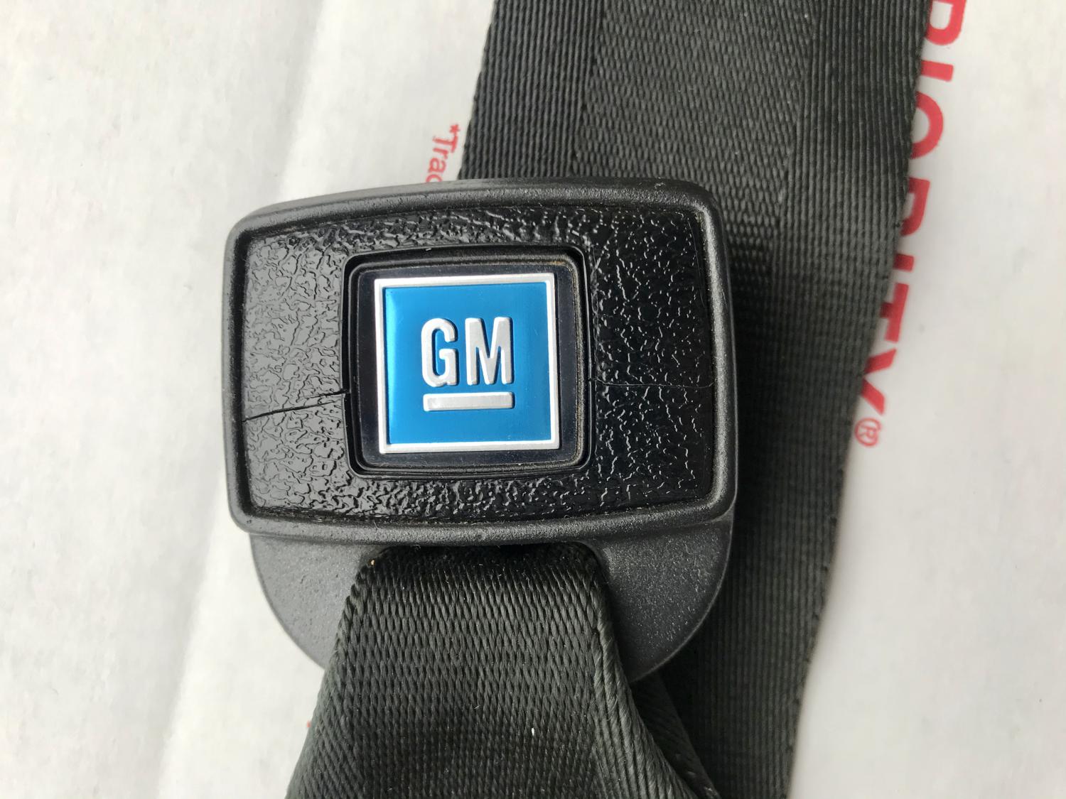 These are the small buckle design that GM introduced mid-year 1972 and will work with most 1972-74 GM cars. This style seat belts are hard to find in good usable condition, and nobody reproduces them. These are as clean as you will find for 49 year old originals. The belts and stitching are in very good condition with both tags present. The chrome on the latch and hold downs are very nice. The factory black paint on the metal buckle is perfect, showing almost no wear. The plastic button retaining ring on the buckle has a small crack in it which is common for this style buckle (due to age) but it doesn’t affect the functionality. The Parts Place sells a replacement for that trim piece if you choose to replace it. (SOLD)