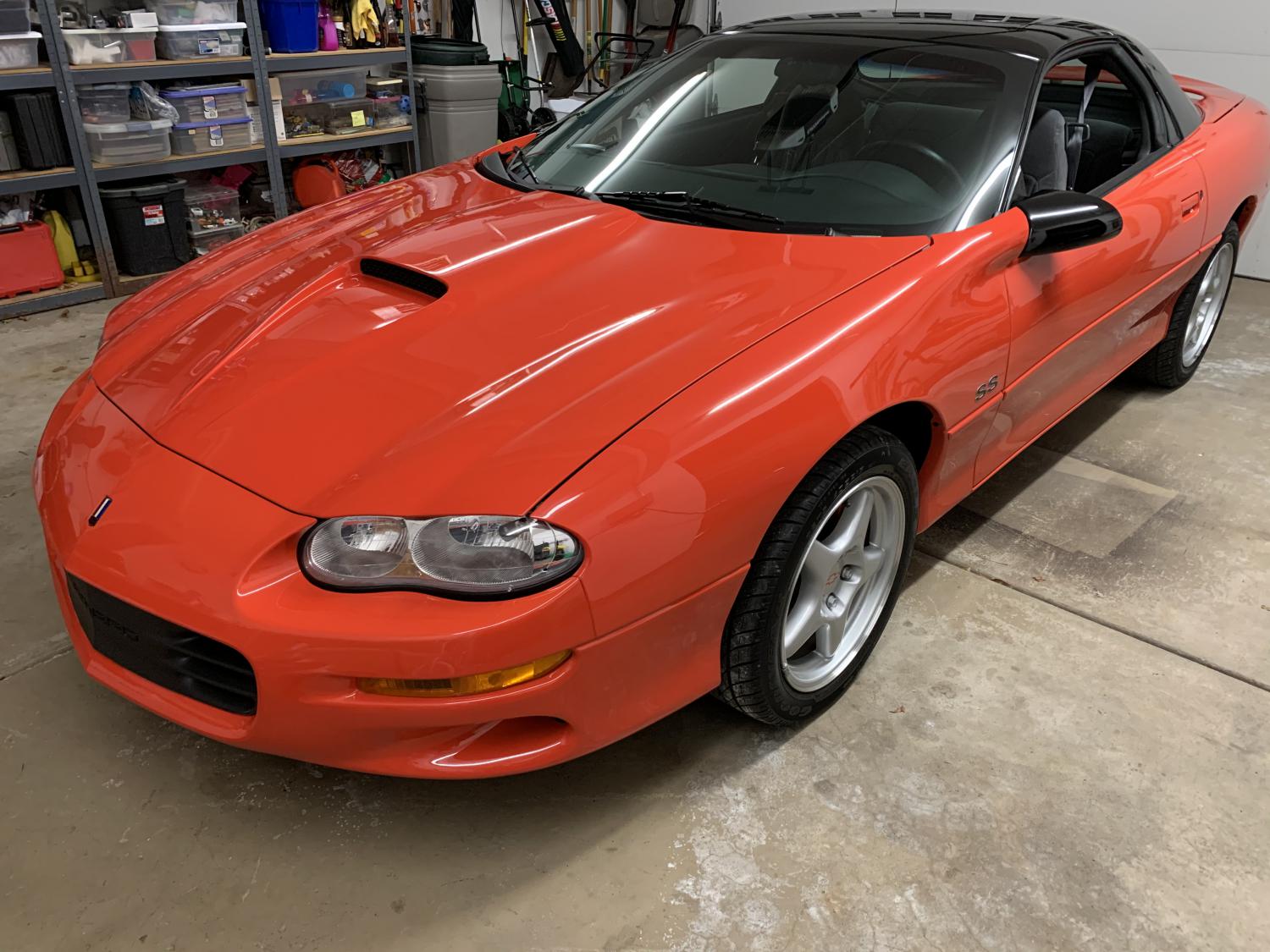 1999 Camaro SS, one of 54 Hugger Orange six-speed / slick top coupes. As to how many had cloth seats, no one knows but I would estimate fewer than 10. 4 owner car with 16K original miles. First two owners had it from new to 2019, then my friend and I owned it since then. In near-show condition. Still on the original tires. Runs and drives perfect. Every piece of paper back to new including the hand-written dealer order and shipper. Comes with original manual, all the paperwork, and an extra set of polished ARE Torq Thrusts (in mint shape, an early made-in-USA set) with Nitto tires for driving.