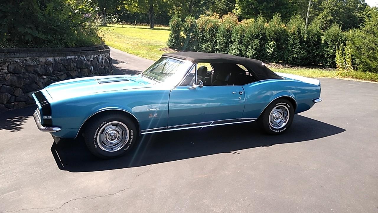 1967 Chevrolet Camaro RS SS Convertible 3SL 4N 396 325/HP, Factory Marina Blue, Turbo 400 with OverDrive kit, 12 bolt JL8 Conversion Mosier Axles with 3:42 posi, Gardner Dual Exhuast with Transverse Muffler, Powered Disk Brakes, Power Top, Original Deluxe Interior, AS2 Headrests, Rear Fold Down Seat, Console Gauge package, Tach, Tilt Steering, Walnut Steering wheel, power steering, power top and factory rear antenna.