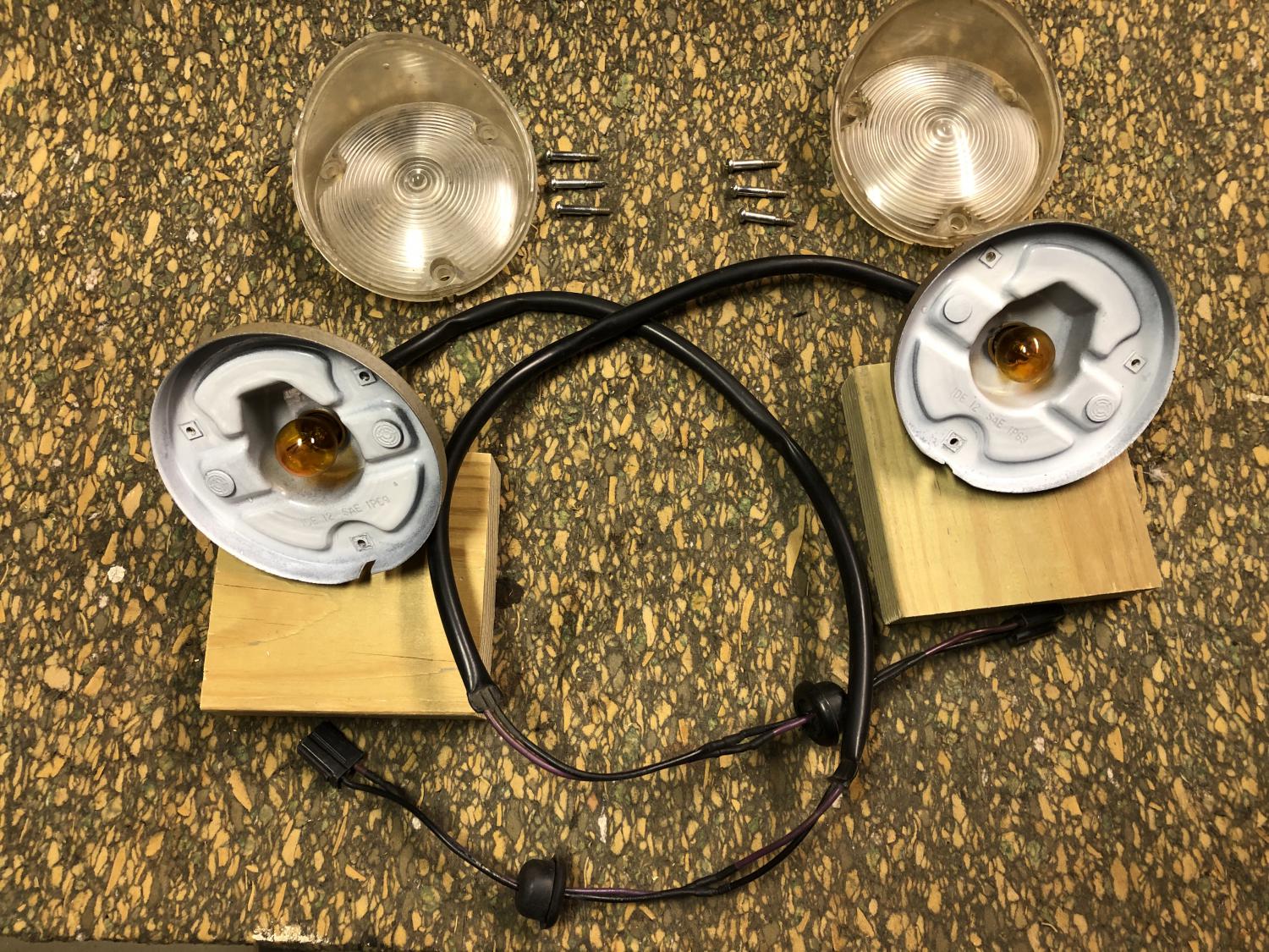 Looking for a pair of front parking lamps with good wire harnesses. the housings are not important. Just the sockets and sleeves that cover the wires.