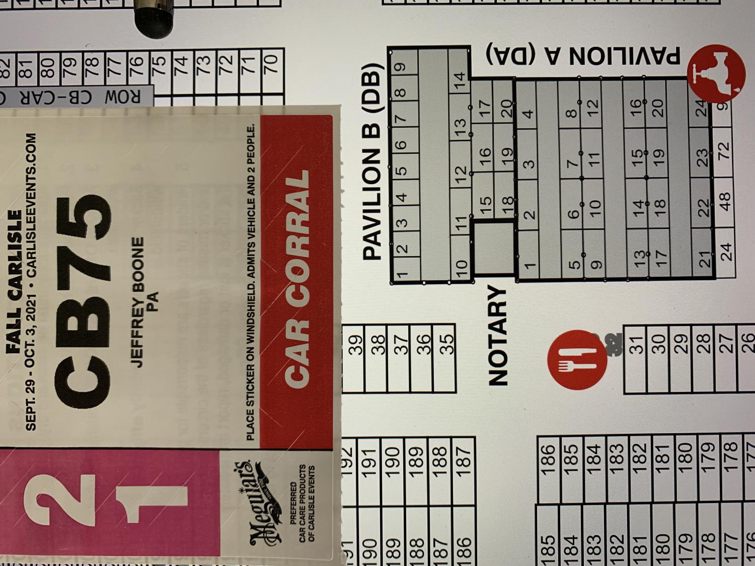 Car Corral Space CB75 for sale, Sept 29th -Oct 3rd. This is a very good location on flat area close to the Pavilion. I can send to you or pickup at Carlisle.