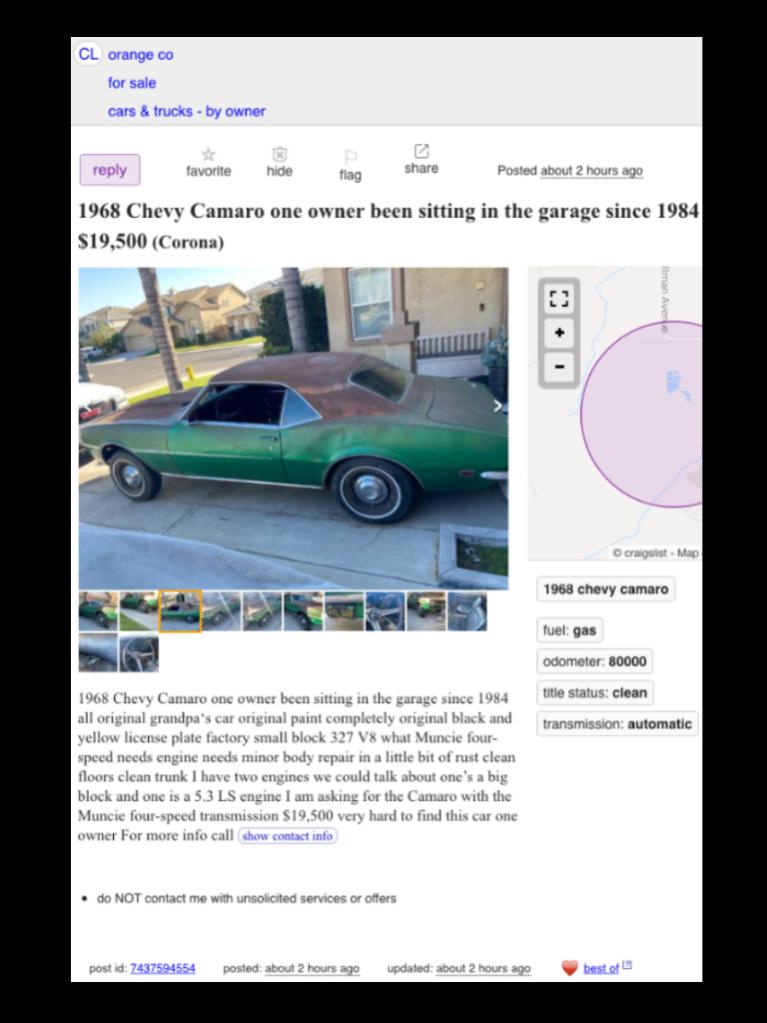 Wow! Good find. I remember when those were $3000 cars in SoCal. Would be a fun one to clean up and drive.
